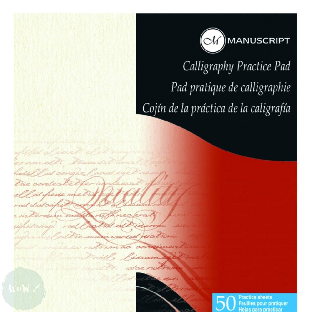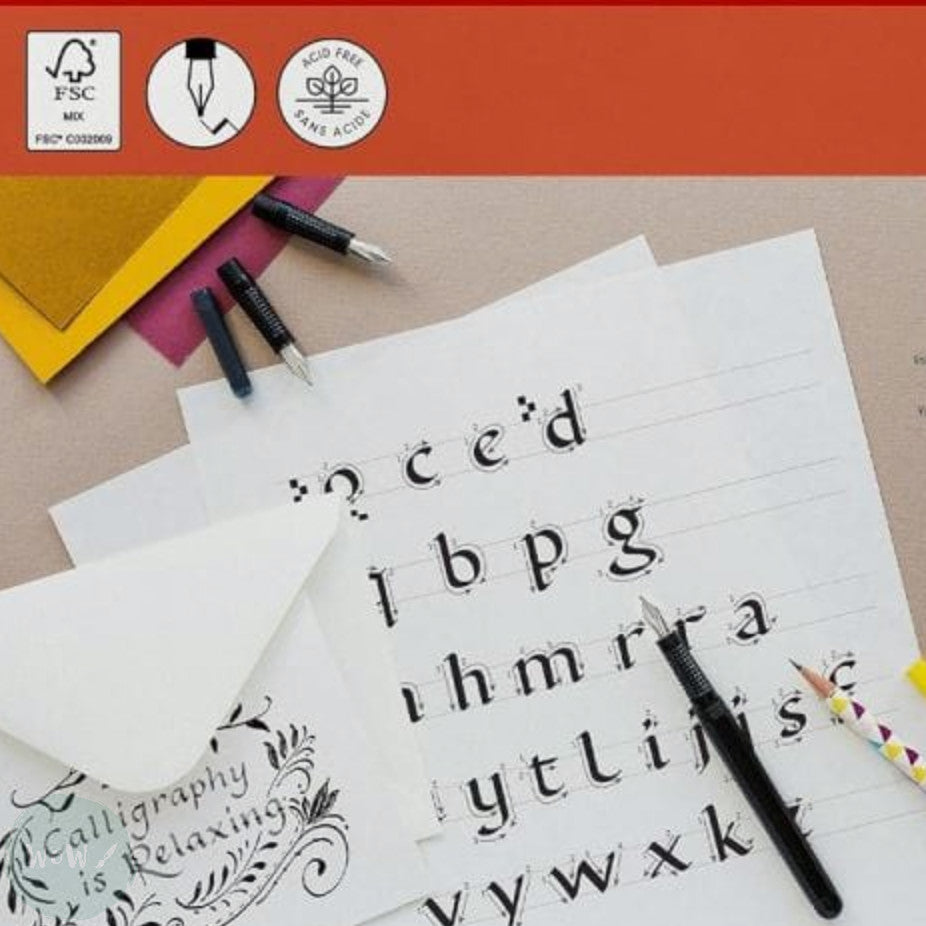 Gummed pad, with 50 sheets 60gsm, bright white, semi-translucent practice paper including separate Calligraphy guideline sheet.