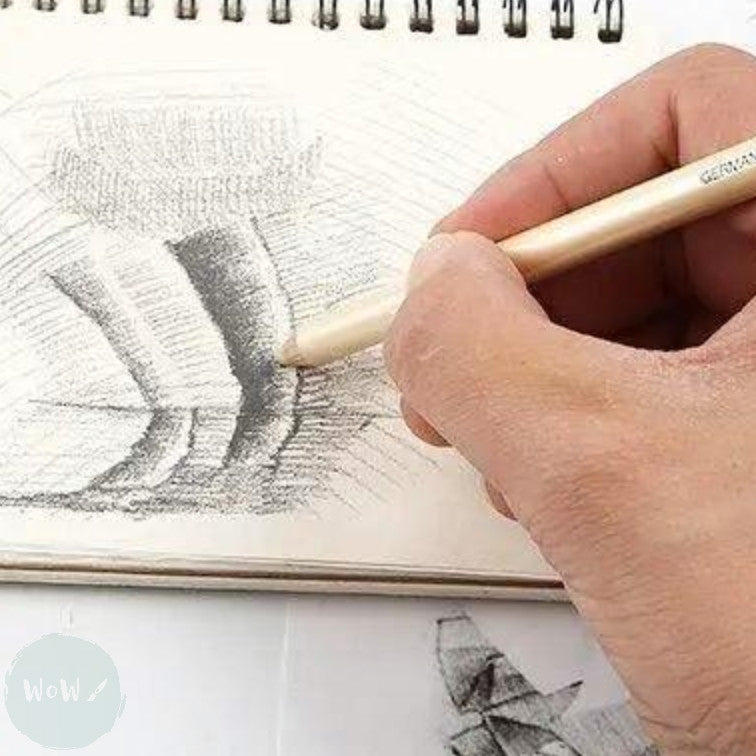 Eraser set in a wood casing that allows it to be sharpened like a pencil it is ideal for fine detail erasing and creating highlights.