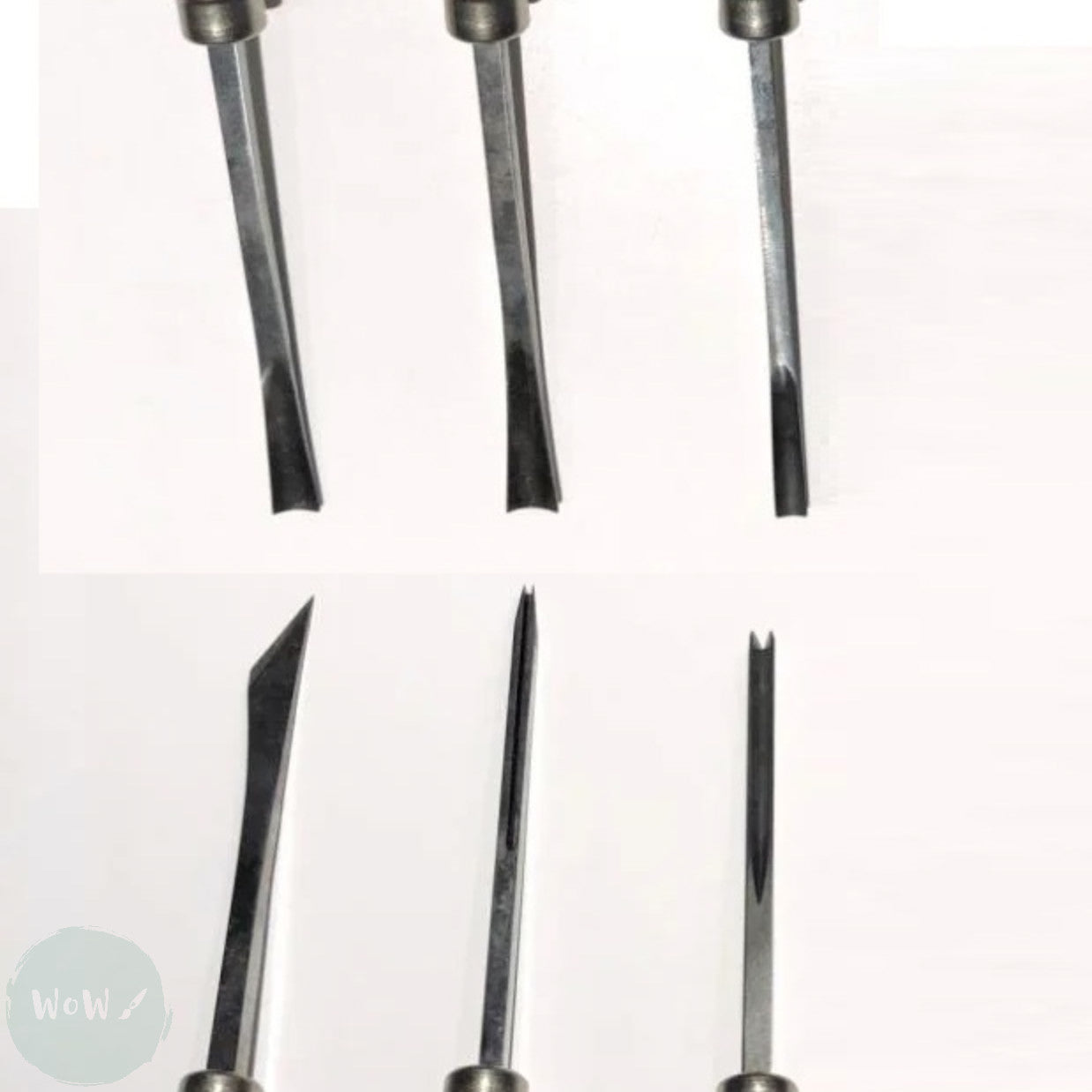 Six piece lino cutting tool set with ergonomic wooden mushroom shaped handles and drop forged, tempered alloy steel blades.