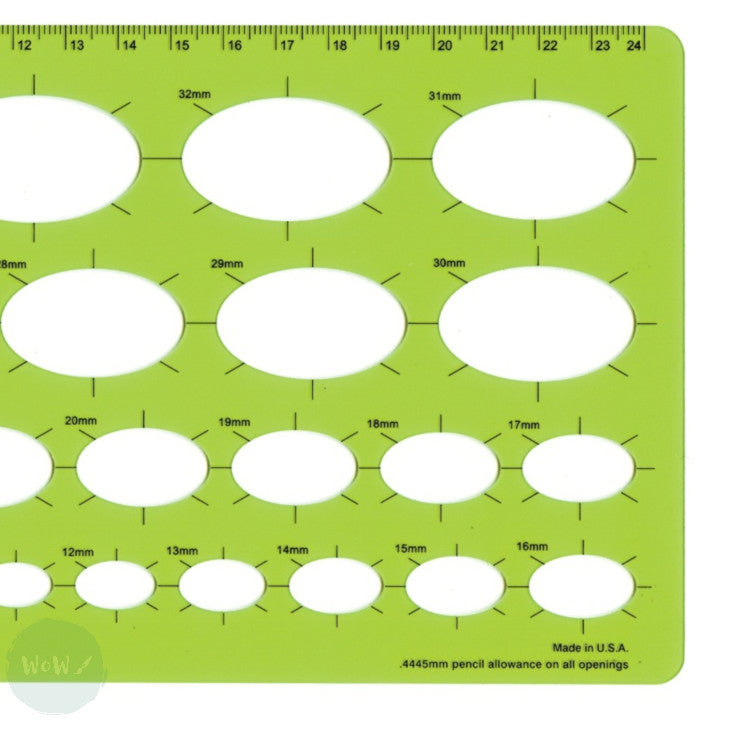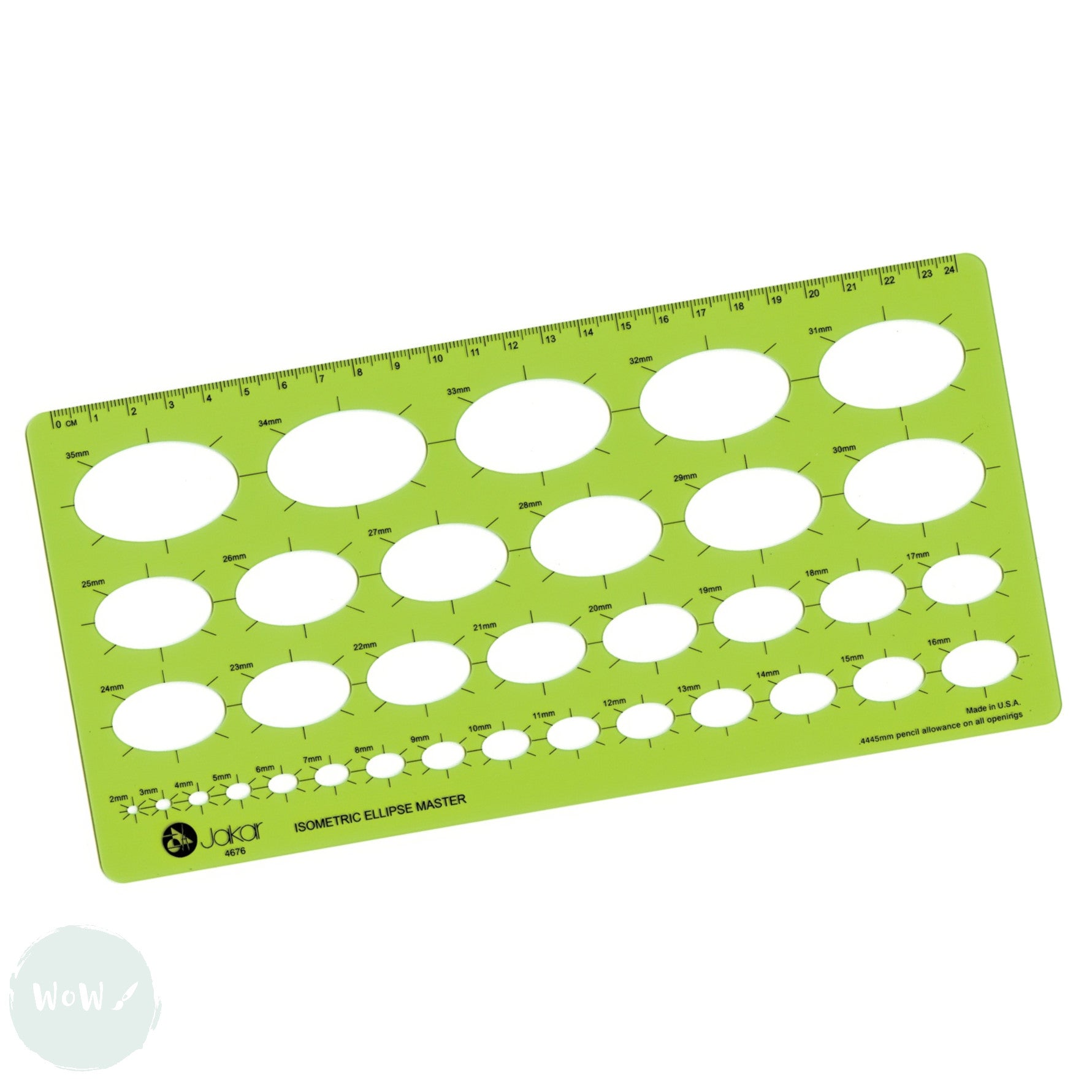 Isometric Ellipse Master 2mm-35mm, manufactured in 0.76mm thick translucent green impact modified acrylic with silk screened printing.