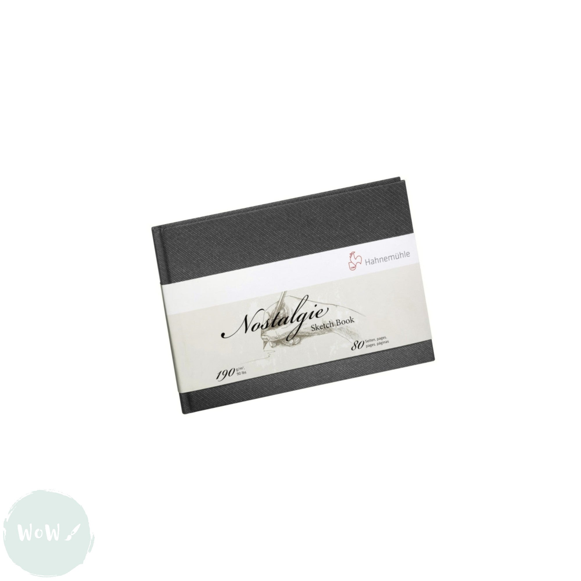 Contains 80 pages/ 40 sheets Acid free, 190 gsm, natural white paper, thread stitched for a solid binding and flatness over two pages, encased in a linen surfaced grey hardback cover, with a red ribbon page mark.