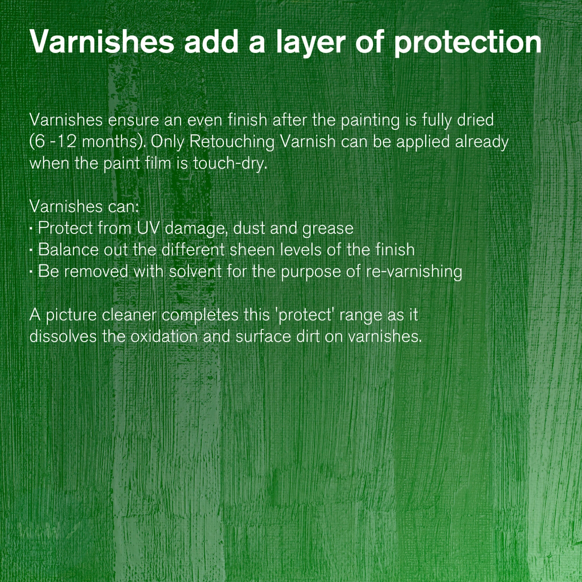If preferred, once the oil paint has fully dried standard Artists varnishes can be applied on top of the Retouching Varnish without having to remove it first.