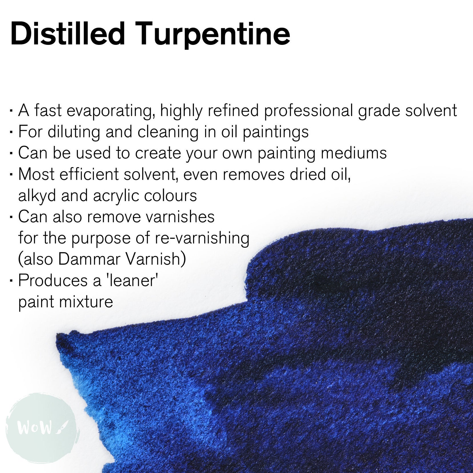 Suitable for removing oil based varnishes and can also be diluted 50/50 with Linseed Oilto create an excellent painting medium.