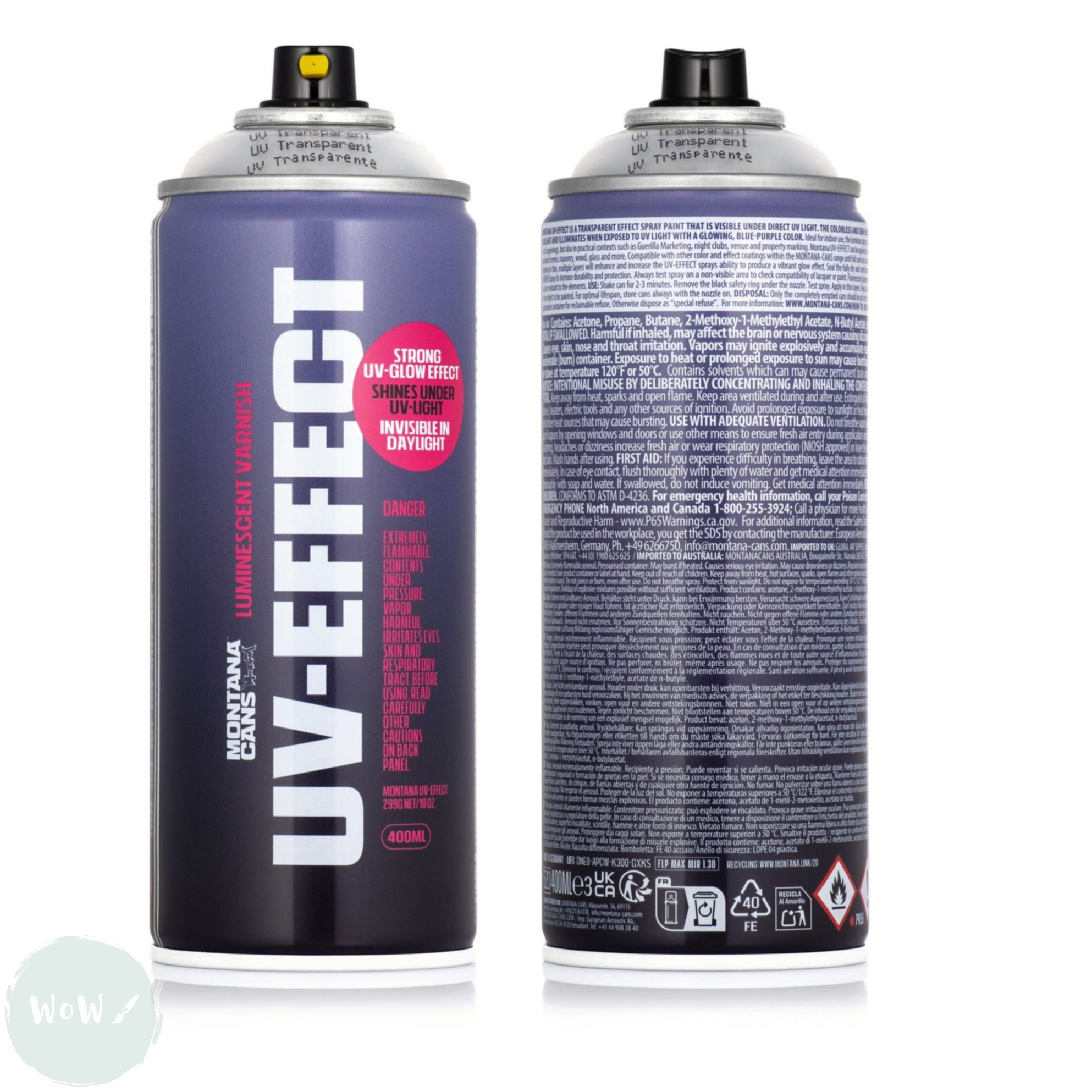 Applying in thin, multiple layers will enhance and increase the UV EFFECT sprays ability to produce a vibrant glow effect. To add durability and protection, the fully dry and cured surface can be sealed with Montana VARNISH Spray in Matt, Semi-Gloss or Gloss.