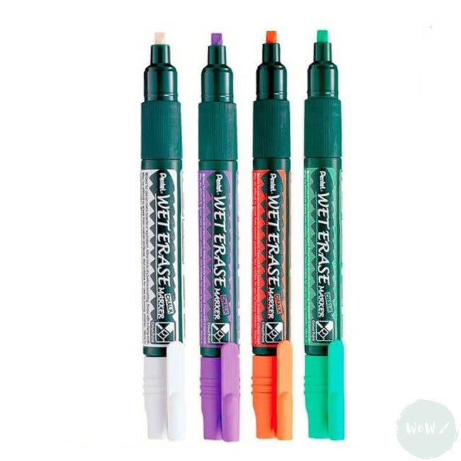 CHALK PAINT MARKERS – Pentel - WET ERASE - Small Chisel Tip – ASSORTED PACK OF 4 (WHITE, ORANGE, VIOLET, GREEN)