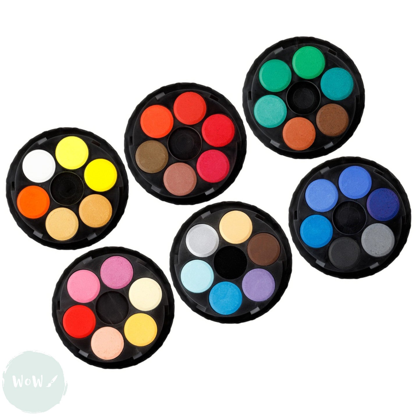 36 colour shades, 22.5mm diameter blocks, in six interconnected round, plastic, trays, with a clear lid.