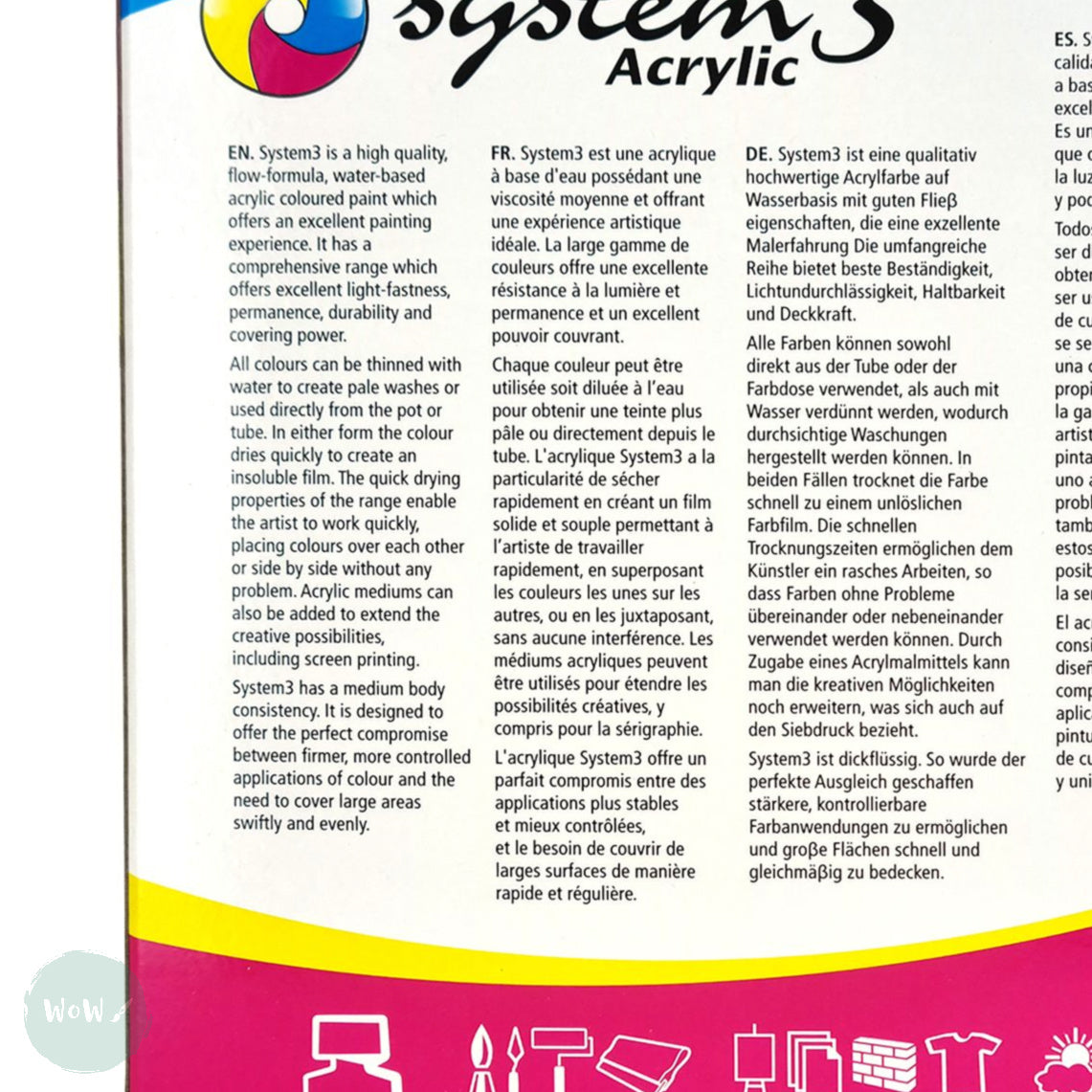 System 3’s range of colours are made up of a comprehensive range of core colours traditionally used by artists and a complementary range of speciality colours, also available individually.
