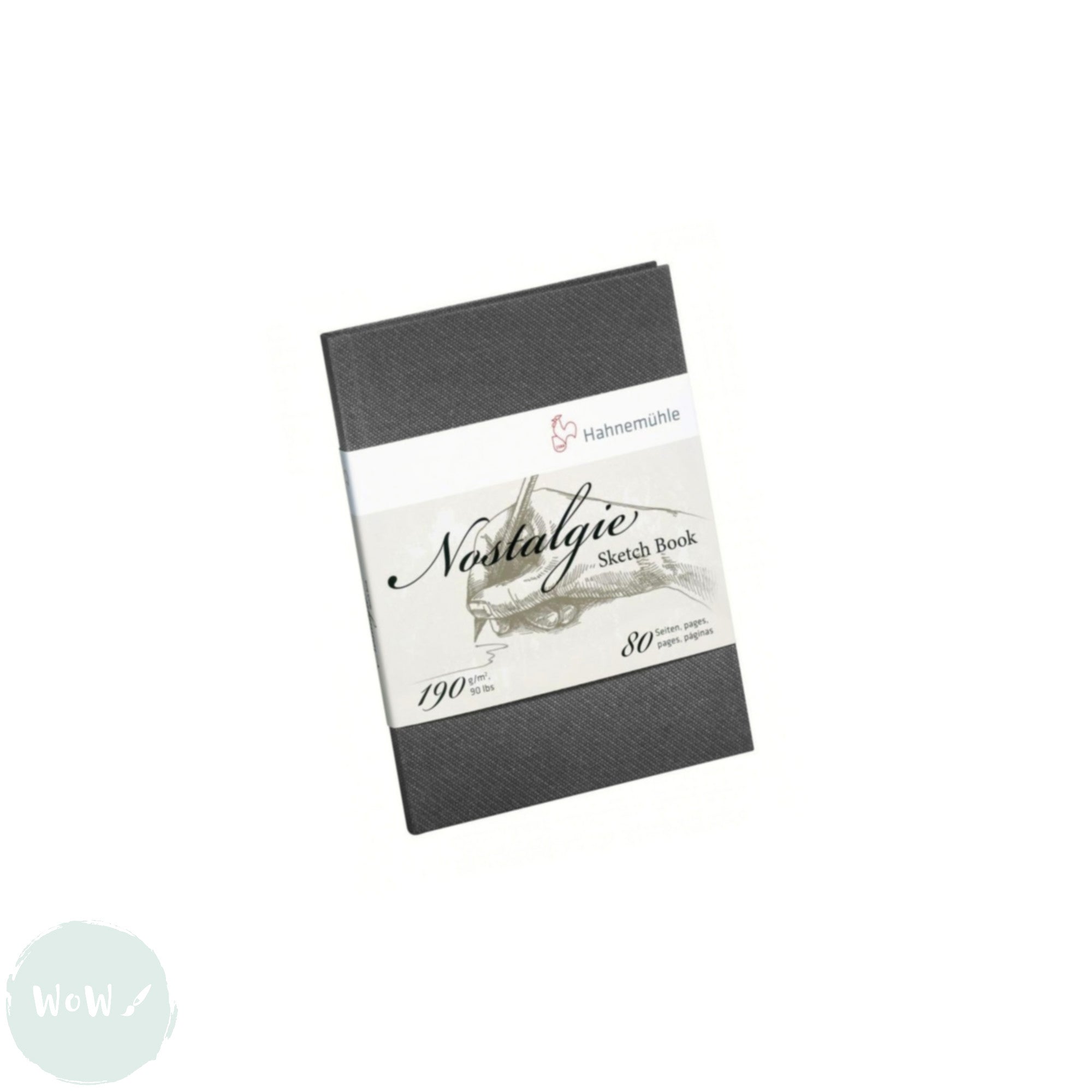 Contains 80 pages/ 40 sheets Acid free, 190 gsm, natural white paper, thread stitched for a solid binding and flatness over two pages, encased in a linen surfaced grey hardback cover, with a red ribbon page mark.